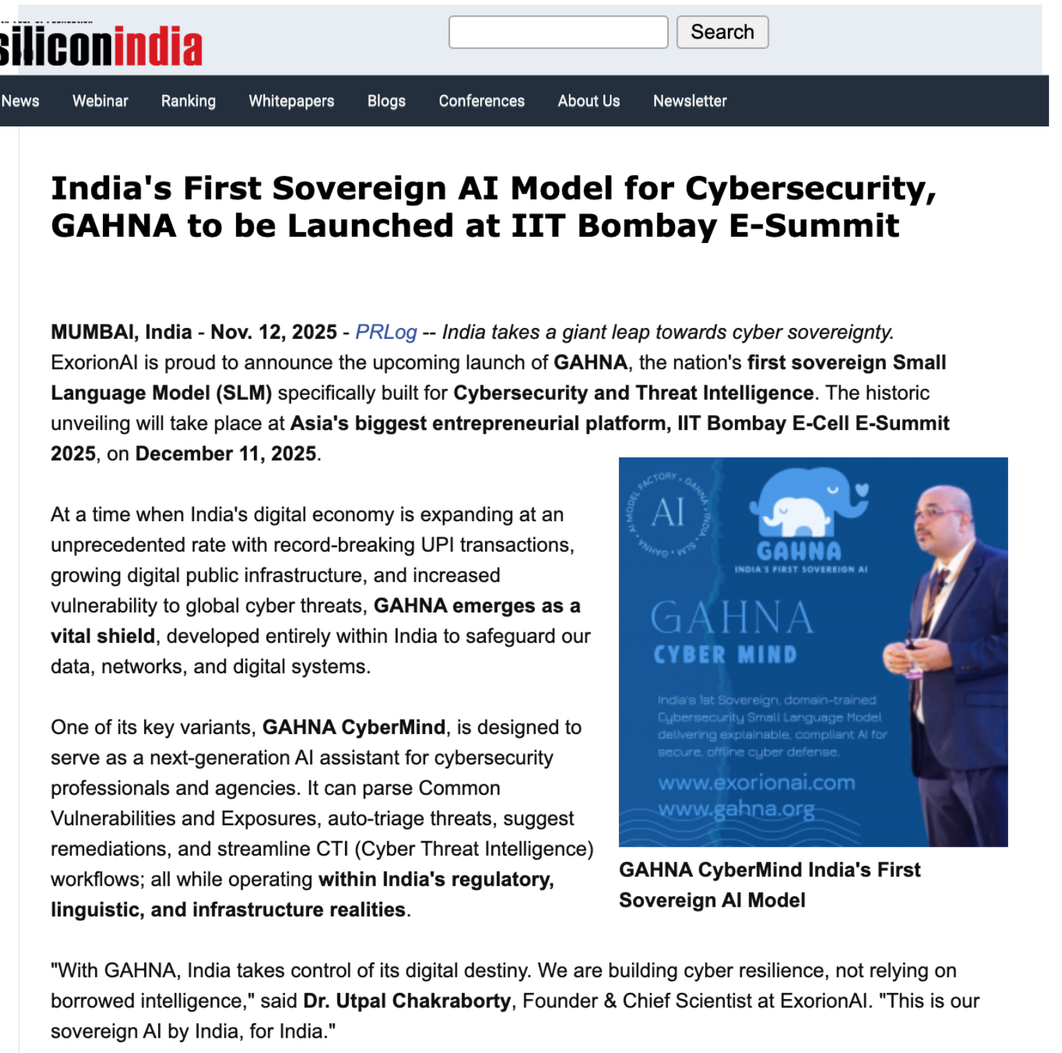 ExorionAI proudly announces the launch of GAHNA and GAHNA CyberMind, India's first Sovereign Small Language Model (SLM) for Cybersecurity, at the prestigious IIT Bombay E-Cell E-Summit 2025 - Asia's largest entrepreneurial summit. As the Innovation Partner of the E-Summit, ExorionAI continues its mission to drive India's sovereign AI revolution by building indigenous, domain-specific language models that are transparent, secure, and locally trained.